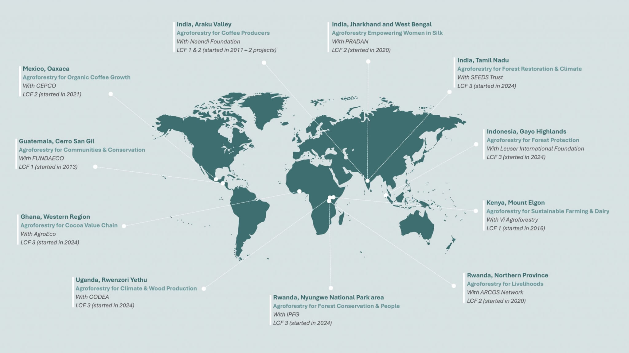 Since 2011, the Livelihoods Carbon Funds have invested in 12 agroforestry projects worldwide. From the coffee hills of Araku Valley, India, to the densely inhabited slopes of Mount Elgon, Kenya, these initiatives embed trees within crop and livestock systems to regenerate forest landscapes, enhance ecosystem functions, and transform farmers’ lives.