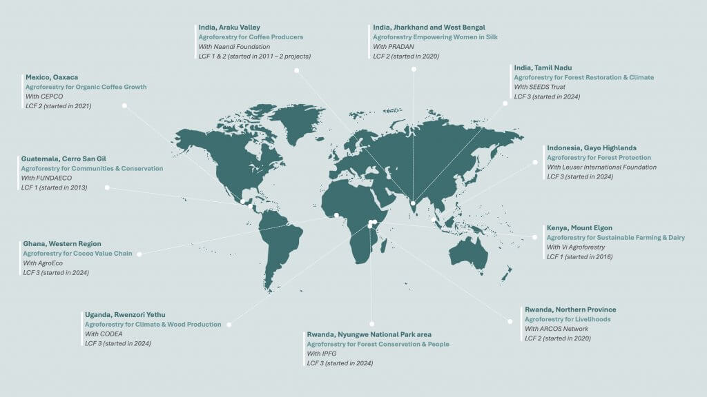 Depuis 2011, les Fonds Cabone Livelihoods ont investi dans 12 projets d’agroforesterie à travers le monde. Des collines caféières de la vallée d’Araku, en Inde, aux pentes densément peuplées du mont Elgon, au Kenya, ces initiatives intègrent les arbres dans les systèmes agricoles et d’élevage pour régénérer les paysages forestiers, renforcer les fonctions des écosystèmes et transformer la vie des agriculteurs.